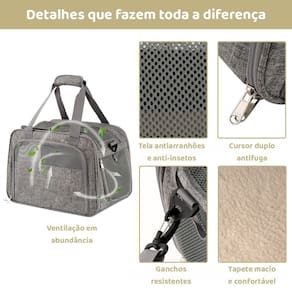 Introdução: A bolsa de transporte é uma solução segura e confortável para o seu bichinho de estimação. Ideal para viagens de avião, pois suas medidas são aceitas na cabine pela maioria das companhias aéreas.