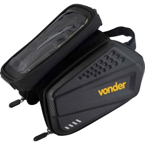 Dimensões: Externa: 210 mm x 160 mm x 185 mm; Interna: Bolsas laterais: 180 mm x 40 mm x 120 mm (2x); Porta-celular: 175 mm x 80 mm x 35 mm