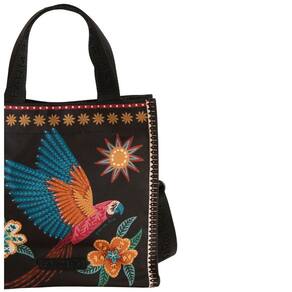 Essa bolsa traz o charme tropical do Brasil em cada detalhe: fundo preto elegante que destaca o bordado colorido de papagaio, flores e sol, compondo um visual autêntico e cheio de personalidade.