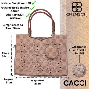 O forro em tecido personalizado com o logotipo Chenson acrescenta um toque de exclusividade, enquanto o fechamento principal em ecler personalizado oferece mais segurança. A alça em PU, com acabamento refinado em costura contrastante, proporciona conforto e elegância no uso diário.