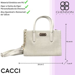 A alça transversal fixa, que combina ferragem dourada acorrentada com PU, proporciona um toque de sofisticação, tornando essa bolsa ainda mais versátil e charmosa. Por dentro, o forro personalizado com o logo Chenson e o compartimento para pequenos objetos ajudam a manter tudo organizado e de fácil acesso. Com essa bolsa, você une elegância e praticidade em qualquer ocasião!