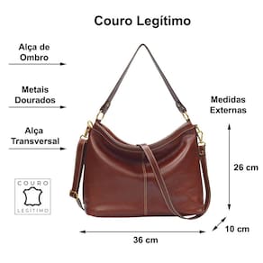 Lindíssima e moderna bolsa de ombro em couro, também com alça transversal e regulável, com excelente espaço interno, muito prática e fácil de usar, ideal para o dia a dia ou em produções casuais que necessitem de estilo sem abrir mão da elegância. Na alça curta, há uma argola em cada extremidade que trazem um charme à bolsa. Todos os metais são dourados para combinar com a sofisticação e elegância que um produto em couro merece. O acabamento interno é em forro de cetim de texturas variadas tipo animal print (padrão oncinha) ou similar, possui um bolsinho interno fechado por zíper e outros dois para pequenos objetos e celular. O fechamento da parte superior é feito com zíper de metal dourado e na parte externa traseira possui mais um bolso extra fechado por zíper, também em metal dourado, para carregar pequenos objetos.