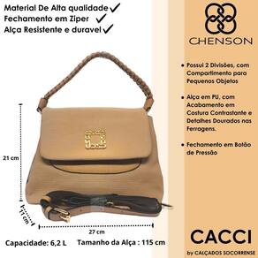 Confeccionada em PU, material de excelente qualidade, essa linda bolsa possui 2 divisões para pequenos objetos. O forro é em tecido personalizado com o logo Chenson. O fechamento principal é com ecler personalizado e botão magnético. A alça trançada em PU com design de mão oferece conforto e estilo. Com acabamento em costura contrastante e detalhes dourados nas ferragens, ela adiciona um toque sofisticado e elegante à peça.