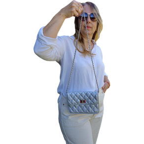 Compacta nas medidas (19x13x5 cm), mas surpreendentemente funcional, acomoda o essencial com charme: celular, maquiagem, chaves e pequenos itens. A alça em corrente metálica traz um ar de glamour instantâneo, valorizando qualquer look com sofisticação.