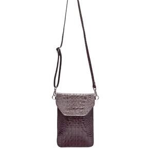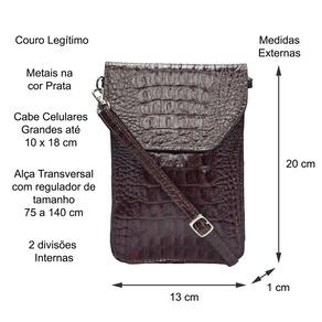 Linda bolsinha transversal, porta celular em couro, possui 2 divisões internas para levar pequenos objetos, documentos, dinheiro, cartões e seu celular. Seu fechamento na parte superior é através de botão ímã, forro de poliéster em tons neutros, metais no banho prateado. Pequena, leve, bem funcional e prática. Espaço suficiente para celulares de vários tamanhos (vide abaixo as medidas).