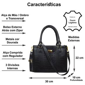 Bolsa feminina tamanho médio, estruturada, para usar na Mão, no Ombro ou Transversal em Couro. A queridinha das brasileiras, essa bolsa é moderna e elegante. Contém 3 divisões internas, alça curta e comprida (com comprimento regulável), muito prática e fácil de usar, ideal para o dia a dia ou em produções casuais que necessitem de estilo sem abrir mão da elegância. Na parte traseira possui 1 bolso fechado por zíper, proporcionando segurança para seus pequenos objetos. Todos os metais são dourados para combinar com a sofisticação e elegância que um produto em couro merece. O acabamento interno do forro é com texturas variadas tipo animal print (padrão oncinha), floral ou similar. Em uma das divisões internas possui um bolsinho fechado por zíper e outros dois abertos para pequenos objetos ou celular. O fechamento da parte superior é feito também com zíper.