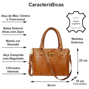 Bolsa feminina tamanho médio, estruturada, para usar na Mão, no Ombro ou Transversal em Couro. A queridinha das brasileiras, essa bolsa é moderna e elegante. Contém 3 divisões internas, alça curta e comprida (com comprimento regulável), muito prática e fácil de usar, ideal para o dia a dia ou em produções casuais que necessitem de estilo sem abrir mão da elegância. Na parte traseira possui 1 bolso fechado por zíper, proporcionando segurança para seus pequenos objetos. Todos os metais são dourados para combinar com a sofisticação e elegância que um produto em couro merece. O acabamento interno do forro é com texturas variadas tipo animal print (padrão oncinha), floral ou similar. Em uma das divisões internas possui um bolsinho fechado por zíper e outros dois abertos para pequenos objetos ou celular. O fechamento da parte superior é feito também com zíper.