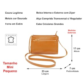 CARACTERÍSTICAS Material Externo : Confeccionada em COURO, de origem bovina com textura lisa e macia. Metais : Todos os metais / ferragens são na cor DOURADA com tratamento de banho antioxidante. Forro : Cetim com texturas em animal print (similar padrão "oncinha") Alça Comprida : Alça fixa não removível medindo 1,5 cm de largura por 140 cm de comprimento, com regulador de comprimento Parte Externa : Frente lisa com bolso externo com zíper, atrás lisa sem detalhes. Parte Interna : Possui 1 divisão principal e 1 bolso fechado com zíper para pequenos objetos Fechamento : Com zíper de nylon de fácil deslize Peso : 350 gramas (ela vazia)