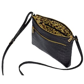 Bolsinha estruturada, pequena, feminina, transversal em couro, com alça comprida para uso transversal ou tiracolo lateral com regulagem de tamanho / altura. Metais na cor dourada e couro com textura. Pode ser usada no dia a dia ou como uma peça curinga para finalizar seu look em seus eventos sociais, festinhas e baladas. O forro é confeccionado em cetim com texturas variadas tipo 'animal print' (padrão oncinha) ou similar, que valorizam ainda mais o produto. Possui 1 bolsinho externo e 1 bolsinho interno ambos fechados com zíper para organizar pequenos objetos. O fechamento da parte superior principal é em ziper de metal que proporciona um fácil deslize, elegância e segurança aos seus objetos.