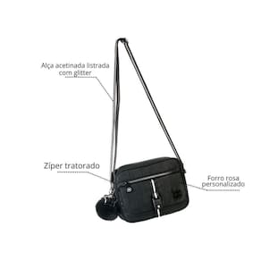 Características e Composição: - Material: Crinkle com efeito brilhoso. - Cor: Preta. - Tamanho: P ideal para itens essenciais . - Alça: Acetinada listrada com glitter, ajustável. - Detalhes adicionais: Chaveiro de pompom e mosquetão de estrela removíveis. - Forro interno: Rosa, com compartimentos para organização. - Fechamento: Zíper tratorado.