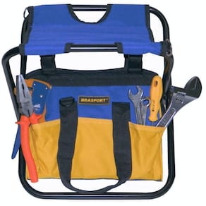 Para auxiliar nas atividades sentadas com ferramentas e utensílios em geral;Confeccionada em poliéster;Pode ser utilizada como Bolsa;Possui alça de mão e alça tiracolo de tecido.Bolsa removível com engates plásticos.Bolsos internos: 1;Bolsos externos: 6;Estrutura tubular articulada (estilo banqueta) com assento em poliéster.