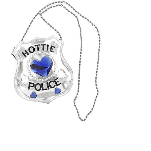 A bolsa Hottie Police tem o formato de um distintivo policial e incrustada com uma joia de coração azul. A bolsa também possui uma alça de corrente e exterior prateado. Uma adição muito necessária a qualquer policial sexy de Halloween!