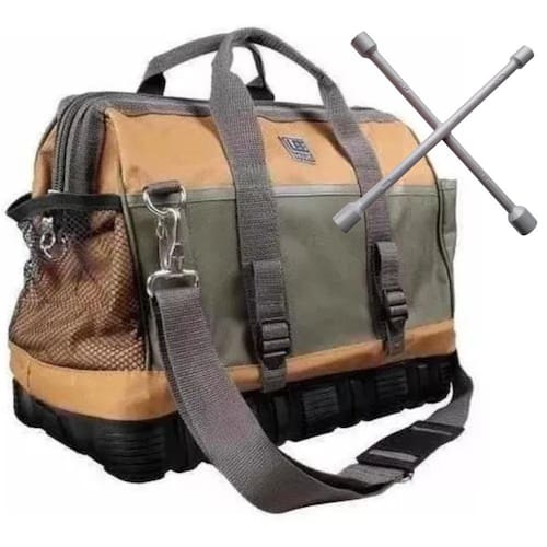 Bolsa Para Ferramentas C/ Fundo De Borracha Profissional + Chave Toco 12x1Impermeável, fundo reforçado com borracha protege ferramentas e objetosDurabilidade comprovadaAlça metálica para martelo, cinto com fivela de encaixe facilitando a aberturaConfeccionado em camada dupla com tecido resistente ao desgaste12 Bolsos + 2 laterais externos8 Bolsos internosBase de borrachaAlém de bolsos, possui um amplo espaço para guardar diversas outras ferramentasDimensão externa da bolsa abertaComprimento: 430mmLargura: 220mmAltura: 330mmPeso: 1.5kgChave de Roda do tipo Cruz 34cm com 4 bocasMarca: Aço ForteCaracterísticas:-Formato: Cruz.-Portátil.-Ótima qualidade e acabamento.-Útil para diversas funções.-Medidas das Bocas: 17, 19, 21 e 23 mm.-Comprimento de uma ponta a outra: 34 cm.Conteudo Da Embalagem :01- Bolsa Fundo De Borracha01- Chave De Roda