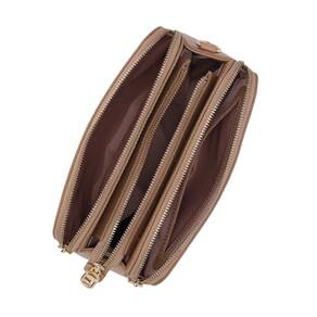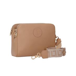 O modelo tem formato pequeno e estruturado traz alça tiracolo larga em gorgorão exclusivo Luz da Lua. Possui três divisórias internas, fecho superior em zíper, puxador e metais dourados. Detalhe para a tag emborrachada, na cor marrom, personalizada com Monograma da marca na parte frontal.