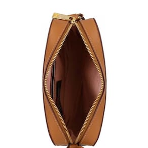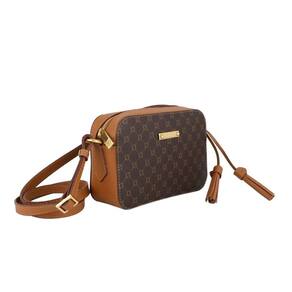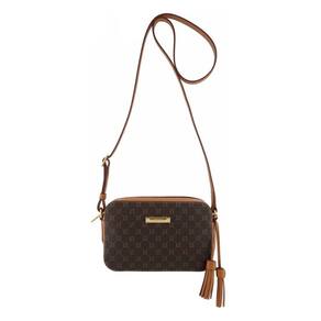 O modelo é estruturado e tem formato retangular e laterais arredondadas. Possui alça fina e longa, fecho duplo na parte superior em zíper. Com um compartimento interno e porta-cartões.