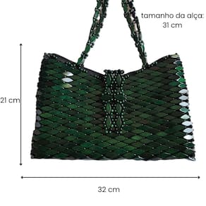 Bolsa confeccionada com pecinhas de madeira no formato de pequenos losângulos, pintados e envernizados, verde, com acabamento interno em cetim e fechamento com zíper. Alça CURTA de MADEIRA formato retangular.