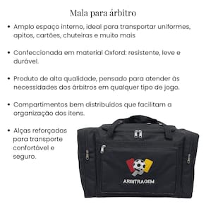 Esse modelo de bolsa mala possui um design robusto e funcional, a mala de arbitragem é ideal para quem busca organização e resistência no transporte dos itens de arbitragem, como uniformes, chuteiras e demais acessórios. Produzida em material Oxford de alta qualidade, ela oferece excelente durabilidade, suportando o uso constante e as exigências do ambiente esportivo.