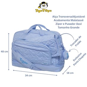 Bolsa Mala Maternidade Grande Tigor T Tigre Azul Bebê Menino Luxo Matelassê Premium Organizada Encante-se com a elegância e funcionalidade da Bolsa Maternidade Grande <a name="_Hlk208736539"></a>Tigor T Tigre Little Shine . Criada para mamães exigentes, ela combina estilo, praticidade e durabilidade em uma única peça irresistível. Sofisticação instantânea: acabamento em matelassê, logo em foil metalizado e zíper e puxadores azul com puxadores coordenados — detalhes que elevam o design a um novo patamar de charme e elegância. Tigor T Tigre Little Shine Organização eficiente: Compartimento principal espaçoso, bolso frontal decorativo, bolsos laterais e internos garantem acesso fácil a fraldas, roupas extras e itens essenciais. Trocador de Fralda Portátil Incluso Conforto e versatilidade: Alças de mão e transversal ajustável e removível com ombreira para carregar como bolsa ou tiracolo, conforme sua necessidade. Durabilidade a seu favor: Confeccionada em nylon resistente com acabamento refinado, pronta para acompanhar o ritmo do dia a dia da maternidade com estilo e segurança. Benefícios: Exclusividade & tendência: Inspire confiança com uma peça que exala design moderno e referência fashion. Praticidade máxima: Bolsos estratégicos e acabamento premium facilitam a rotina de passeios e cuidados com o bebê. Versatilidade inteligente: Ajuste a alça conforme o momento leve no ombro ou no braço com máximo conforto. Durabilidade comprovada: Materiais selecionados para resistir aos desafios diários da maternidade com beleza. Aposte no melhor para você e seu bebê — Leve hoje a Bolsa Maternidade Grande Tigor T Tigre Little Shine e receba com entrega rápida e segura. Estoque limitado, garanta já a sua Tamanho Grande : A 48cm X L 34cm X P 18cm