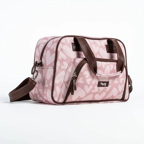 Na cor rosa, tem tamanho médio e vem com estampa de corações, o que deixa a bolsa ainda mais charmosa e delicada, se tornando uma peça ideal para o enxoval do seu bebê.