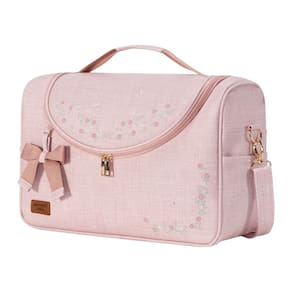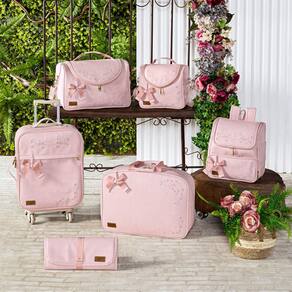 Na cor rosa, ela conta com detalhes de flores bordados, super delicada, é muito sofisticada, tem tamanho médio, acompanha também um laço, no tom rosê que dá um charme para a mesma.