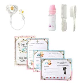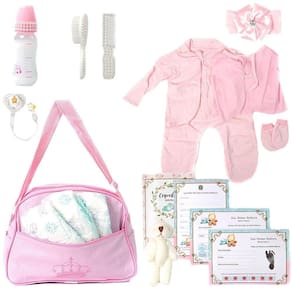 Conteúdo: - 01 Bolsa Maternidade - 01 Pagão Rosa - 01 Par de Luvas - 01 Mamadeira - 01 Pentinho - 01 Escova - 01 Chupeta com Prendedor - 03 Fraldas - 01 Kit de Certificados