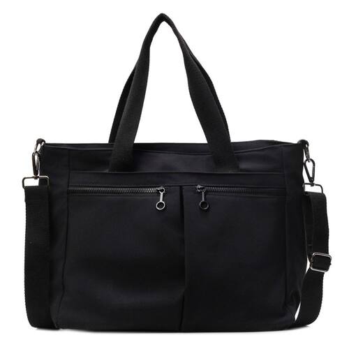 Material: tela Tamanho: 42x13x28 cm Peso: 480 g Estilo minimalista e moderno — Design elegante em preto sólido que combina facilmente com roupas casuais, escolares ou de viagem. Interior espaçoso — Grande capacidade para transportar livros, laptop, roupas e itens essenciais para o dia a dia ou viagens de fim de semana. Armazenamento organizado — Dois bolsos frontais com zíper e compartimentos internos mantêm os itens seguros e de fácil acesso. Material de lona durável — Feito de lona resistente e leve, garantindo uso duradouro e fácil manutenção. Opções de transporte versáteis — alça ajustável para usar tiracolo, bolsa de ombro ou mochila, além de alças superiores para transporte em estilo bolsa.