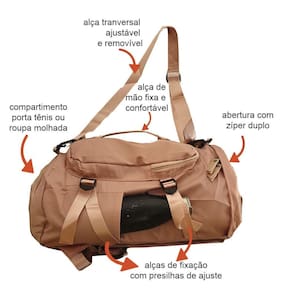 Bolsa Mochila De Viagem VE10410 Cor: salmao - Compartimentos inteligentes para separar todas as suas necessidades - Abertura principal com zíper dupo e cobertura nos zíperes - Compartimento exclusivo para armazenar tênis, roupas molhadas ou outras necessidades - Bolso frontal generoso com zíper - Bolsos laterais com cintas de fixação e presilhas de ajuste - Bolso traseiro para armanzenar as alças em caso de utilizar como transversal ou mala de mão - Alças de costas acolchoadas, ajustáveis sendo possível armazenar no bolso traseiro para opção como Mala de Mão ou Tiracolo - Alça de mão fixa e confortável - Alça transversal ajustável e removível Tamanho Aproximado em cm: AxLxP 48x27z18
