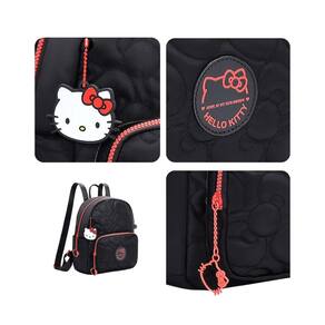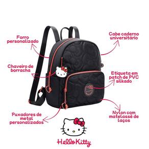 Confeccionada em nylon com matelassê de laços, possui detalhes em vermelho, forro personalizado vermelho, chaveiro exclusivo da Hello Kitty e espaço interno que comporta caderno universitário com facilidade.