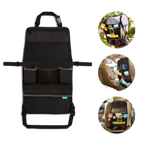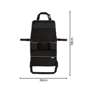 O produto é fixado na parte de trás do encosto dos bancos dianteiros, oferecendo bolsos e compartimentos de diferentes tamanhos para acomodar diversos objetos.