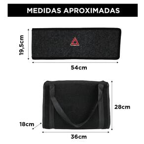 Nesse kit para organizar o porta malas do carro, a bolsa de ferramentas acompanha o porta triângulo de sinalização que possui as medidas necessárias para guardar o item de segurança do veículo.
