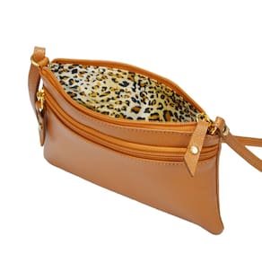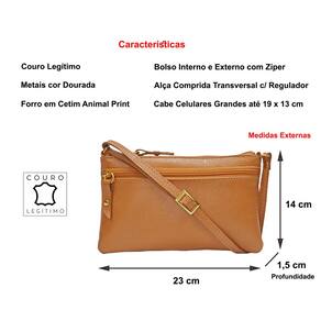 Bolsinha PEQUENA, feminina, transversal em couro, com alça comprida para uso transversal ou tiracolo lateral com regulagem de comprimento da alça. Metais na cor dourada, couro em textura floater bem macio. Muito prática para uso no dia a dia. O forro é confeccionado em cetim com texturas variadas tipo 'animal print' (padrão oncinha) ou similar, que valorizam ainda mais o produto. Possui 1 bolsinho externo fechado com zíper para organizar pequenos objetos. O fechamento da parte superior principal é em ziper de nylon que proporciona um fácil deslize e segurança aos seus objetos.