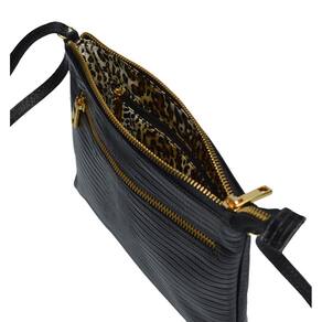 Bolsinha estruturada, pequena, feminina, transversal em couro, com alça comprida para uso transversal ou tiracolo lateral com regulagem de tamanho / altura. Metais na cor dourada e couro com textura. Pode ser usada no dia a dia ou como uma peça curinga para finalizar seu look em seus eventos sociais, festinhas e baladas. O forro é confeccionado em cetim com texturas variadas tipo 'animal print' (padrão oncinha) ou similar, que valorizam ainda mais o produto. Possui 1 bolsinho externo e 1 bolsinho interno ambos fechados com zíper para organizar pequenos objetos. O fechamento da parte superior principal é em ziper de metal que proporciona um fácil deslize, elegância e segurança aos seus objetos.
