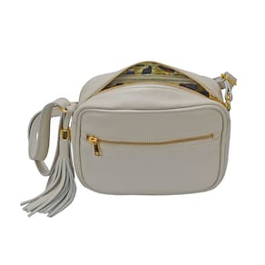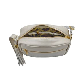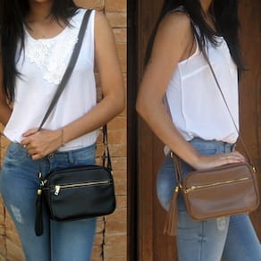 Bolsa transversal feminina, pequena, charmosa, prática com alça transversal comprida confortável de 2 cm de largura e comprimento regulável de 70 cm a 150 cm para um ajuste de acordo com sua altura corporal. Muito prática, ideal para o dia a dia, lazer ou levar naquela viagem que precise carregar seus objetos com segurança e comodidade. Embora pequena possui um bom espaço interno e permite carregar carteiras, maquiagem, celular grande, chaves, documentos pessoais, etc. Na parte frontal possui 1 bolso fechado por zíper para pequenos objetos. Todos os metais são na cor dourada com banho antioxidante para combinar com a sofisticação e elegância que um produto em couro merece. O acabamento interno é com forro com texturas variadas tipo animal print (padrão oncinha), floral ou similar. Possui um bolsinho interno fechado com zíper para pequenos objetos ou celular. O fechamento da parte superior é feito por zíper de metal dourado. Possui um lindo enfeite lateral de franja em couro com metal dourado.