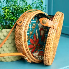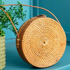 Bolsa Redonda De Palha Rattan Com Alça De Couro Importada De Bali