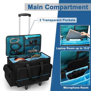 - 3 formas de transporte: 2 alças longas acolchoadas e 1 alça de ombro removível para facilitar o transporte do organizador de armazenamento de cabos ao sair; o carrinho telescópico removível (até 93,5 cm) permite que você carregue acessórios pesados