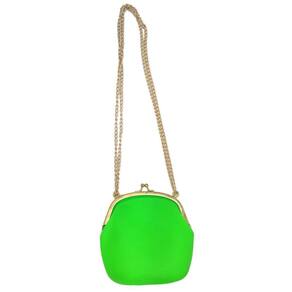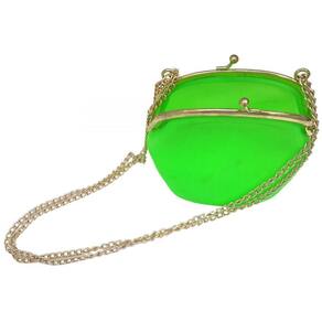 - Abertura e fechamento da bolsa é por pressão de pequenos pinos em metal de aspecto dourado, assim como as correntes para carregar