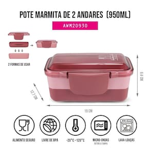 Agora ficou mais fácil organizar seus alimentos para um dia longo. A marmita de 950ml possui 2 andares, podendo ser em conjunto ou separadamente. Feito de material polipropileno, é resistente e possui tampa com travas para evitando acidentes. Produto livre de BPA com qualidade Jacki Design. Conheça a linha completa da coleção CONCEPT e complete o seu kit! (INSTRUÇÕES DE USO: Retire a tampa antes de levar ao micro-ondas; usar somente para aquecer comida, não para cozinhar; Vai ao freezer e lava-louças; Temperatura de uso: -20C ~120C; Limpe usando uma esponja macia e detergente).