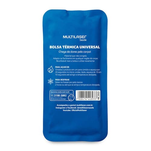- Material que não congela; - Adapta-se facilmente em qualquer região do corpo; - Reutilizável: lave a bolsa e utilize novamente; - Para aquecer: Envolva o produto em um pano úmido e aqueça por 20 segundos no micro-ondas. Após, aqueça de 10 em 10 segundos até atingir a temperatura desejada; - Para resfriar: Deixe no freezer por pelo menos 2 horas ou até que se atinja a temperatura desejada;