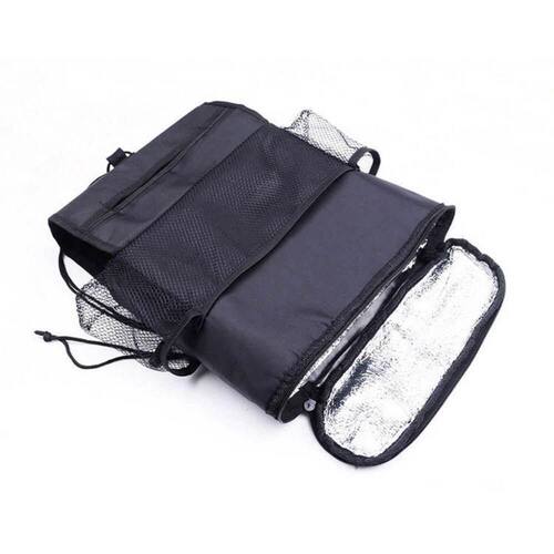 Possui cinta ajustável, tipo cinto de com fecho rápido que sustenta a bolsa em volta dos suportes de apoio de cabeça do banco do carro para maior .