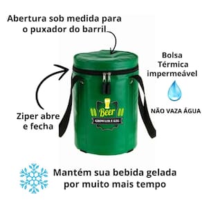 A bolsa é feita sob medida para o barril e a novidade, ela vem com quatro Cartelas de gelo em Gel para colocar nas laterais da Bolsa Térmica. Mantendo por muito mais tempo seu Chopp gelado, até a última gota.