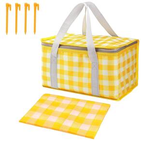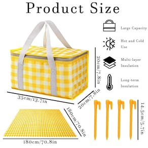 - Conteúdo da embalagem: 1 bolsa térmica para piquenique, 1 toalha descartável para piquenique, 4 estacas amarelas para fixação no chão