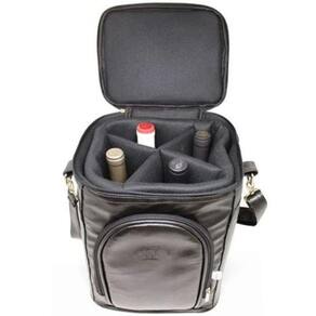 Material externo confeccionado em couro ecológico. Bolso frontal para acessórios (Ideal para guardar saca rolha, cortador de lacre, termômetros, anel de gargalo ou aerador). Compartimento interno para 4 garrafas ou 2 garrafas e 2 taças.