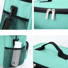 - Divisórias: 4 (2 laterais em tela, 1 frontal com zíper, 1 compartimento térmico principal)