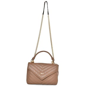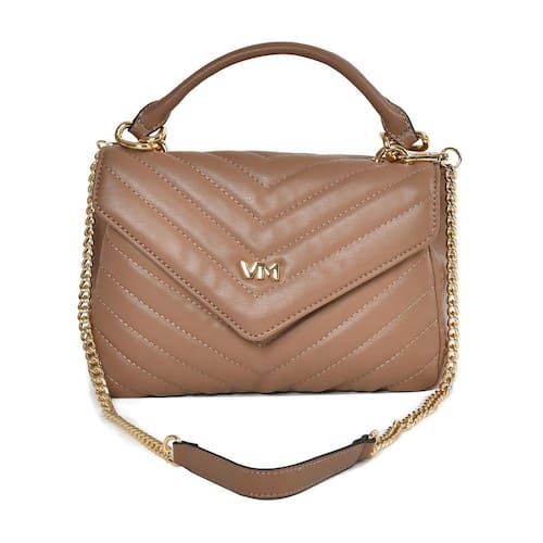 Bolsa Tiracolo sintético tamanho médio, no formato quadrado com matelassê e logo em metal VM na tampa. Alça de mão fixa e alça de ombro de corrente com ombreira e mosquetões removível. Dois bolsos internos com zíper e divisória. Fechamento com tampa e botão magnético.