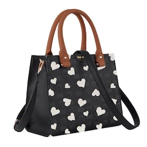 Produzida com a qualidade da marca semax, essa bolsa é confeccionada em mix de pvc com textura e liso, detalhe frontal texturizado com estampa monograma bp, aplicação de silk de corações, metais em light gold, fechamento em zíper e bolso no verso.