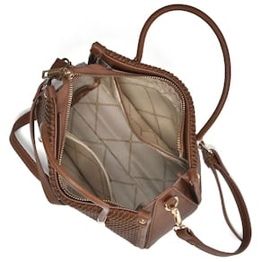 Bolsa Tote Via Marte pequena, confeccionada em material sintético com efeito de matelassê plissado, garantindo um visual elegante e moderno. Possui alça longa ajustável e removível, além de alças de mão fixas para maior versatilidade. O fechamento principal é em zíper, oferecendo segurança e praticidade. O detalhe metálico do logotipo frontal complementa o design sofisticado, sendo ideal para compor produções contemporâneas e funcionais.