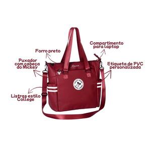 Características Bolsa: - Confeccionada em PVC liso com silhueta prensada - Etiqueta de PVC personalizada - Silk com assinatura do Mickey - Forro preto - Puxador com cabeça do Mickey - Compartimento para laptop - Cabe caderno universitário