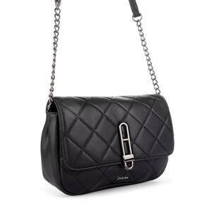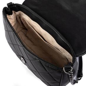 Confeccionada em material sintético de alta qualidade, a bolsa apresenta um amplo espaço interno, perfeito para carregar seus pertences essenciais, além de uma pequena divisória interna para organizar seus objetos menores. Seu destaque fica por conta das costuras na tampa e na parte frontal, que conferem um toque de sofisticação, e dos detalhes metalizados do fechamento, do pin da marca e das correntes na alça, que adicionam um brilho especial e um ar moderno ao acessório. A alça longa permite que você use a bolsa de diversas maneiras, seja transversalmente, como uma crossbody, ou como uma bolsa de ombro.