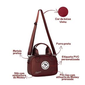 Características: - PVC liso com silhueta prensada - Alça de mão - Alça transversal - Silk com assinatura Mickey - Etiqueta PVC personalizada - Metais pretos - Forro preto - Puxador com cabeça do Mickey
