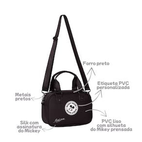 Características: - PVC liso com silhueta prensada - Alça de mão - Alça transversal - Silk com assinatura Mickey - Etiqueta PVC personalizada - Metais pretos - Forro preto - Puxador com cabeça do Mickey